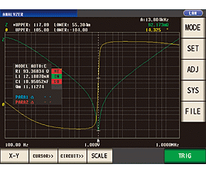 | Three-elements model | Equivalent circuit model: Four models for Coil, Resistance, Capacitor Measurement items: L1 (Inductance), C1 (Capacitance), R1 (Resistance), Qm (Resonance sharpness), fr (Resonance frequency) / fa (Anti-resonance frequency) |