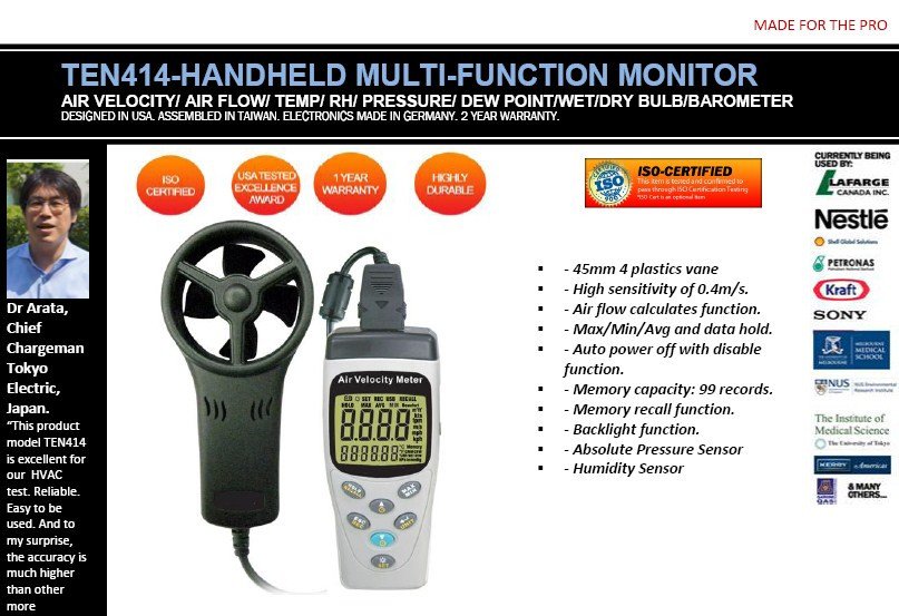 TEN414-MULTIFUNCTION ANEMOMETER/ AIRFLOW METER - VELOCITY/FLOW/ TEMP/RH/PRESSURE/DATALOG