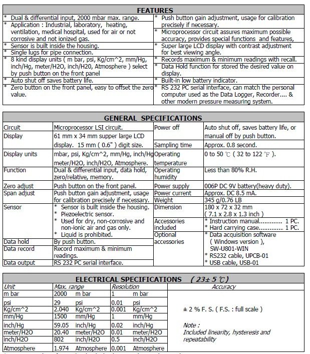 * mbar, PSI, Kg/cm2, inch/Hg, mm/Hg, inch/H20, meter/H2O, Atmosphere.